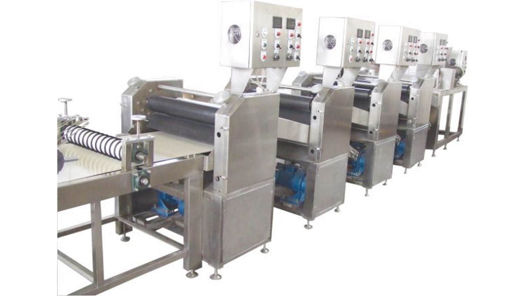 真空和麵機>五螺旋軸擠壓機>魚餃皮壓皮成型機>雙螺旋餡料擠壓機>成型卷包切斷機>包裝輸送工作台