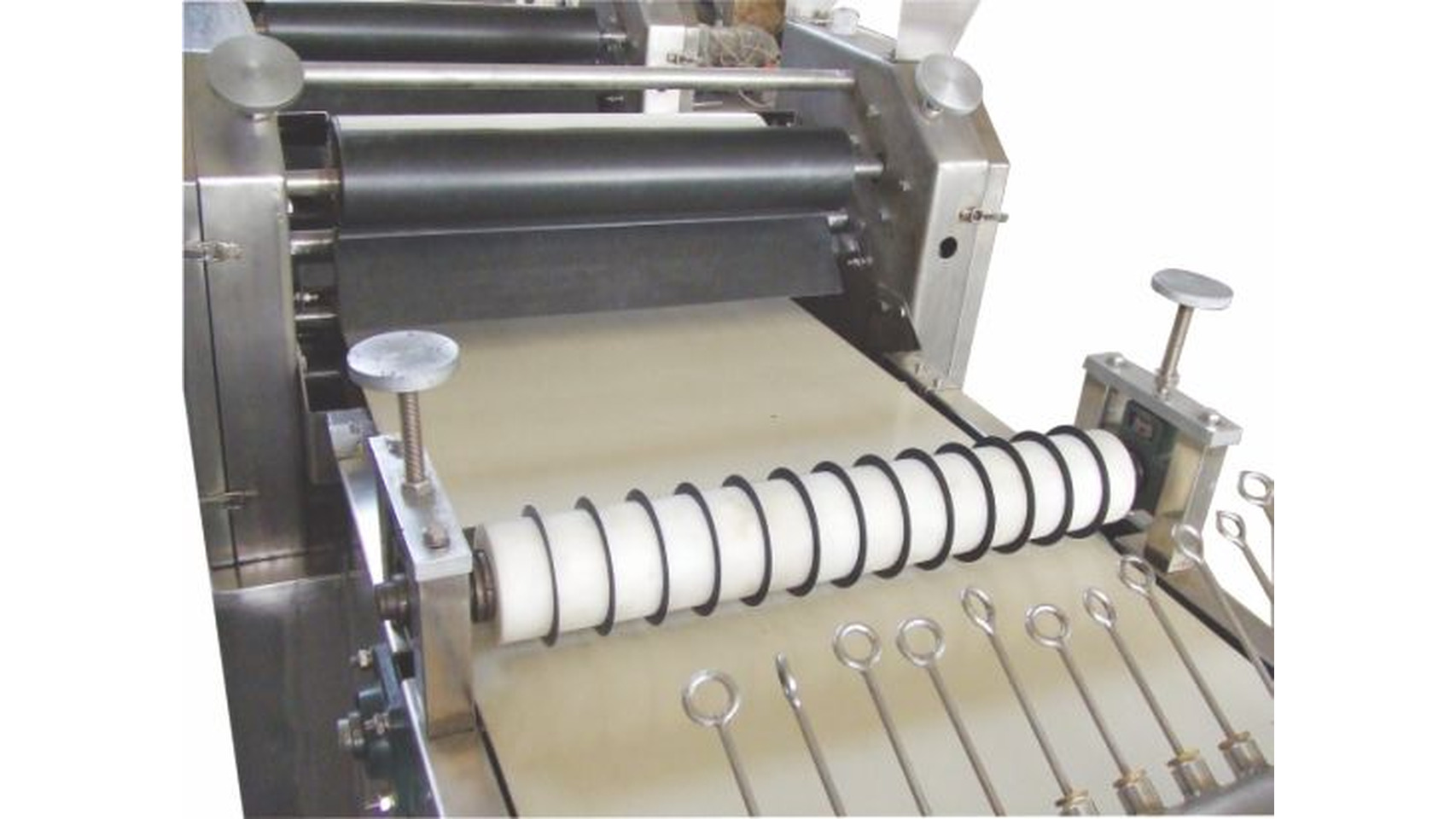 真空和麵機>五螺旋軸擠壓機>魚餃皮壓皮成型機>雙螺旋餡料擠壓機>成型卷包切斷機>包裝輸送工作台