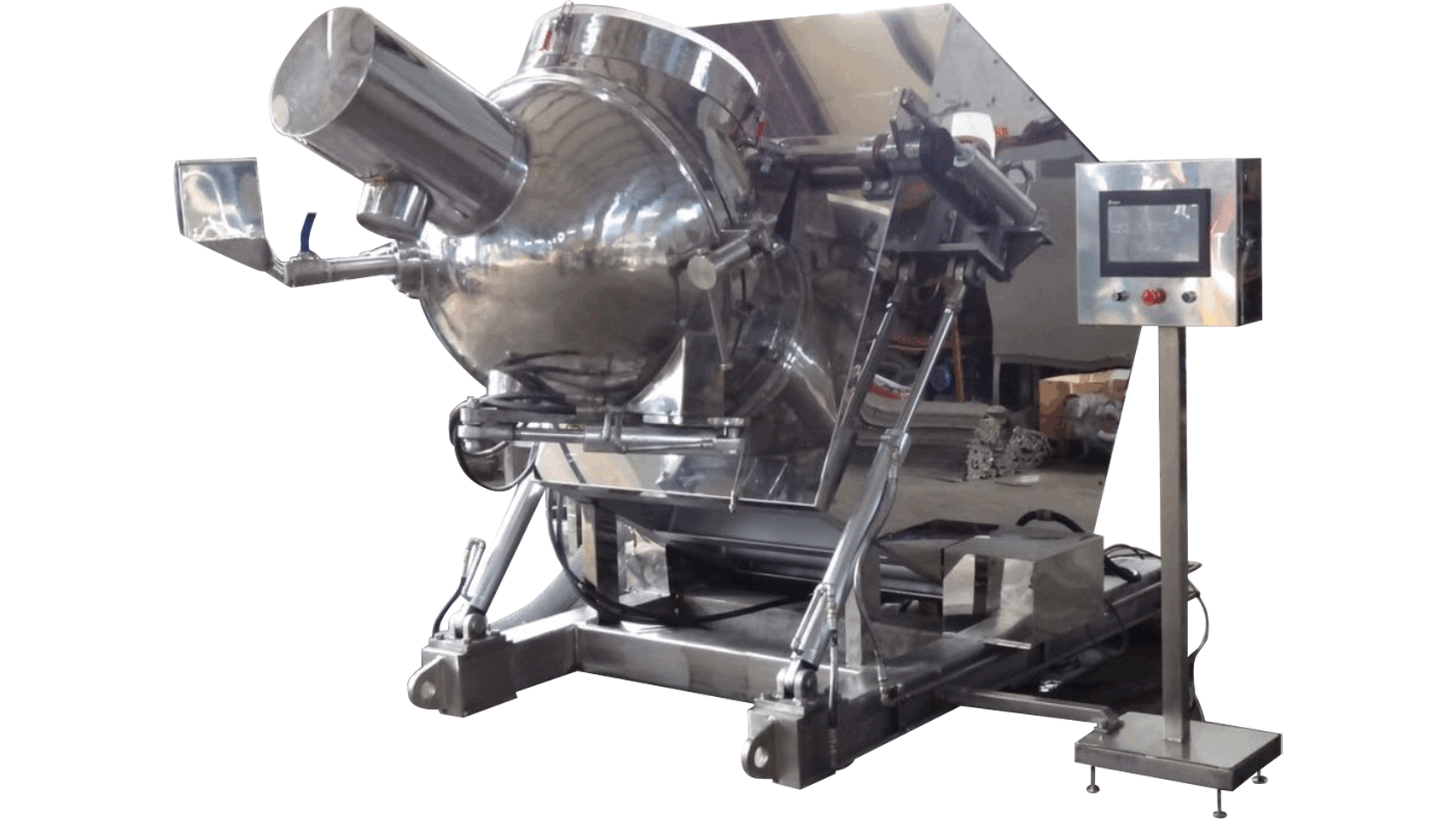 The frozen surimi products and meat products can be chopped, stirred, mixed and emulsified in short time.Vacuum ball cutter is a type of cutting machine that chops, cuts, mixes and emulsifies the raw material products in the spherical tank. The chopping blades chop and mix at high speed in the oblique corner at the bottom of the spherical tank. The blades are designed in a special angle and they can chop and mix raw materials at high speed, so the raw material is pressed downward and uniformly dispersed along the circumferential direction of the spherical tank (please refer to the Product Flow Chart A Below), and then the rotatio nal scraper will scrape the raw material on the in side surface of the spherical ta nk and toss the raw material to the upper center of the spherical tank; then the raw material will be chopped by the choppers again at high speed and be once agai n dispersed along the circumfere ntial directio no f the spherical ta nk.The process of chopping, mixing an d emulsificatio no f raw materials in the spherical ta nk will be repeated.As the raw material is c ontain ed withi nthe vacuum spherical tank and the chopper blade a nd the rotational scraper are designed with special operational mechanism, the raw material can be completely chopped, stirred,mixed and emulsified in short time to produce the most high-end products.